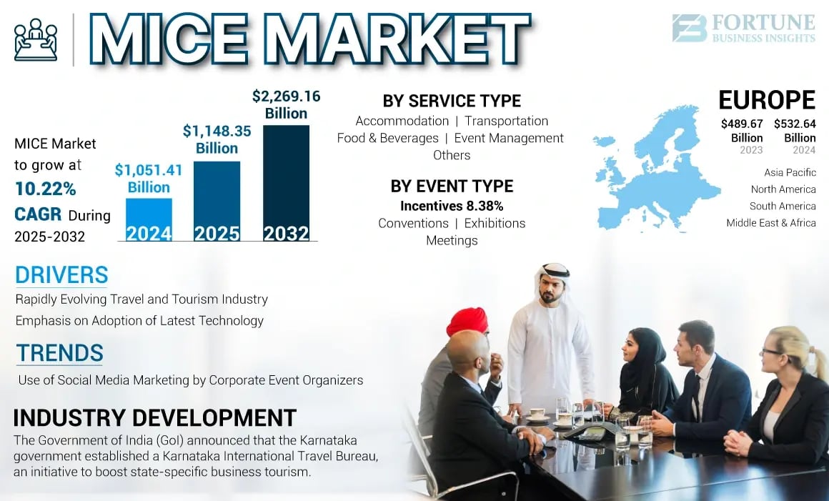According to Fortune Business Insights, Global MICE Market Size was valued at USD 1,051.41 billion in 2024. The market is projected to grow from USD 1,148.35 billion in 2025 to USD 2,269.16 billion by 2032, exhibiting a Compound Annual Growth Rate (CAGR) of 10.22% over the forecast period.